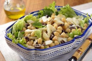- In a large bowl, place the chickpeas, codfish, olives, olive oil, and salt, and mix.