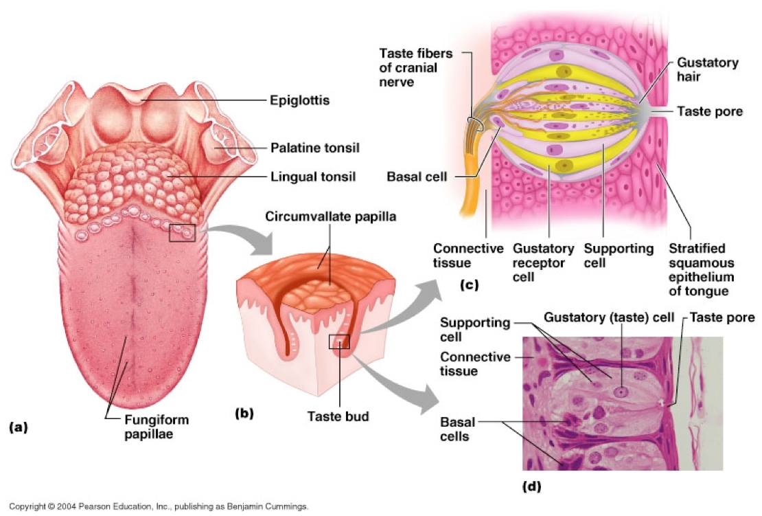 Durante muito tempo, os cientistas acreditavam que os botões gustativos para cada gosto básico estavam concentrados em diferentes regiões da língua, sendo cada uma específica para uma categoria gustativa. No entanto, estudos mais recentes mostram que estes estão distribuídos aleatoriamente por toda a área dorsal da língua, sem delimitações, e em menor número pelo palato mole e epiglote (Feher, 2017).