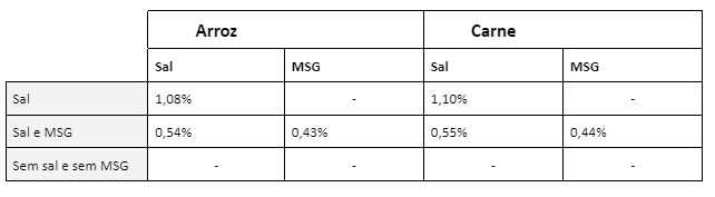 Tabela. Composição das porcentagens, de sal e MSG, utilizada nas preparações de arroz e carne.