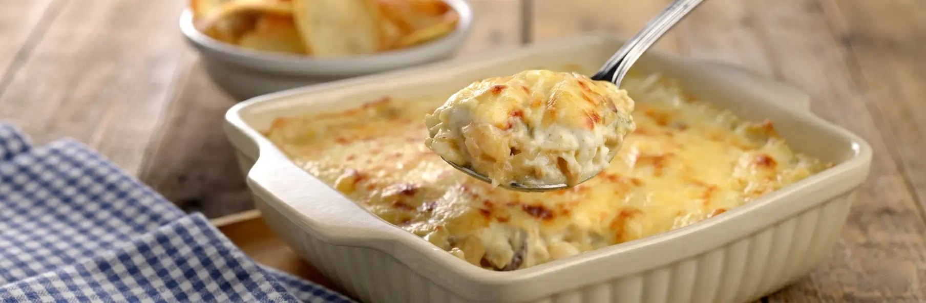 7. Montagem: em um refratário retangular grande (22 x 34 cm), disponha o refogado de bacalhau e, por cima, distribua o molho branco. Finalize com o queijo e leve ao forno médio (180 graus), preaquecido, por 20 minutos, ou até aquecer e dourar ligeiramente na superfície. 8. Retire do forno e sirva em seguida.